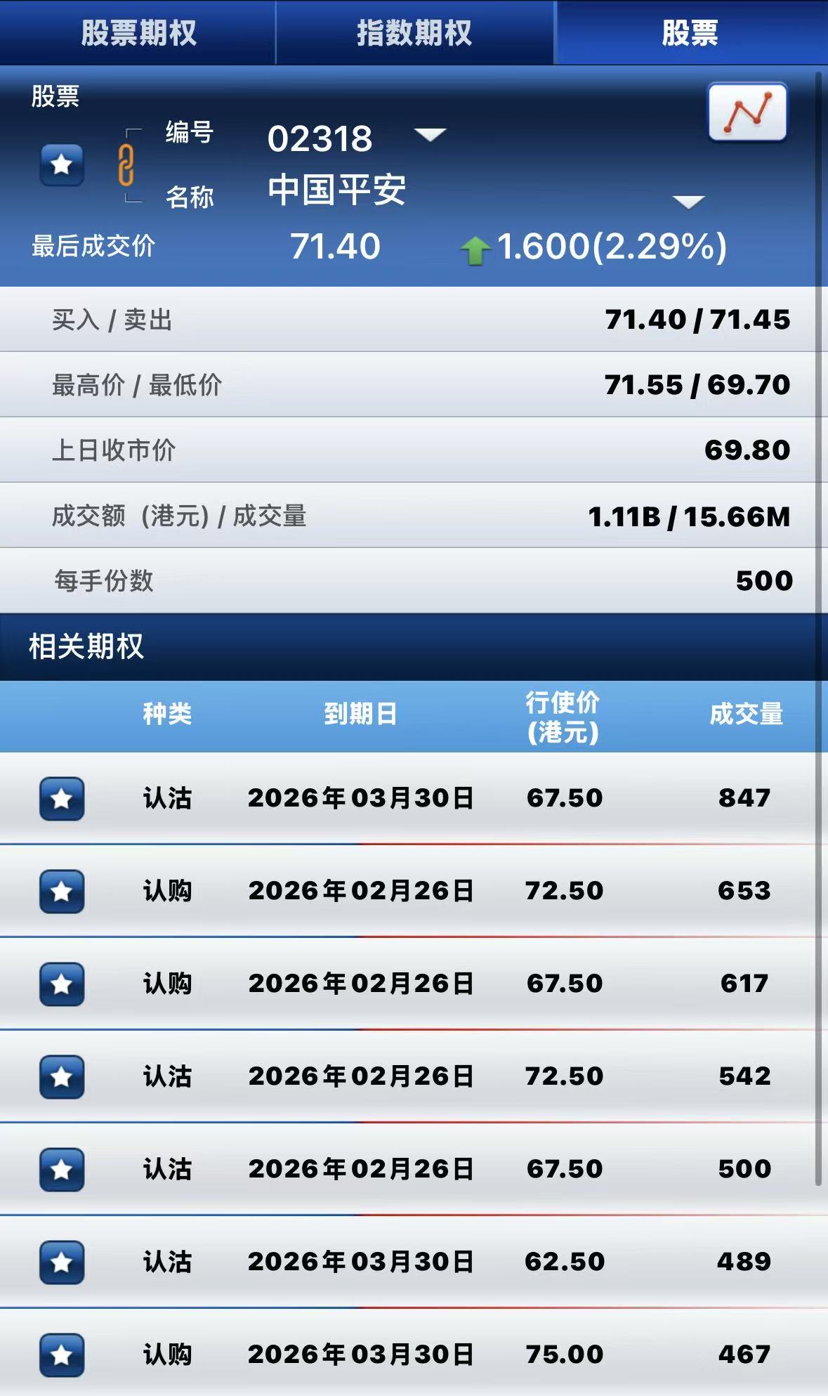 中国平安涨超2%,半日成交超1.2万张合约,其中于3月30日到期行权价67.50港元的认沽期权成交量居前,成交超800张合约。 $PAI.HK 20260330 67.50 PUT$