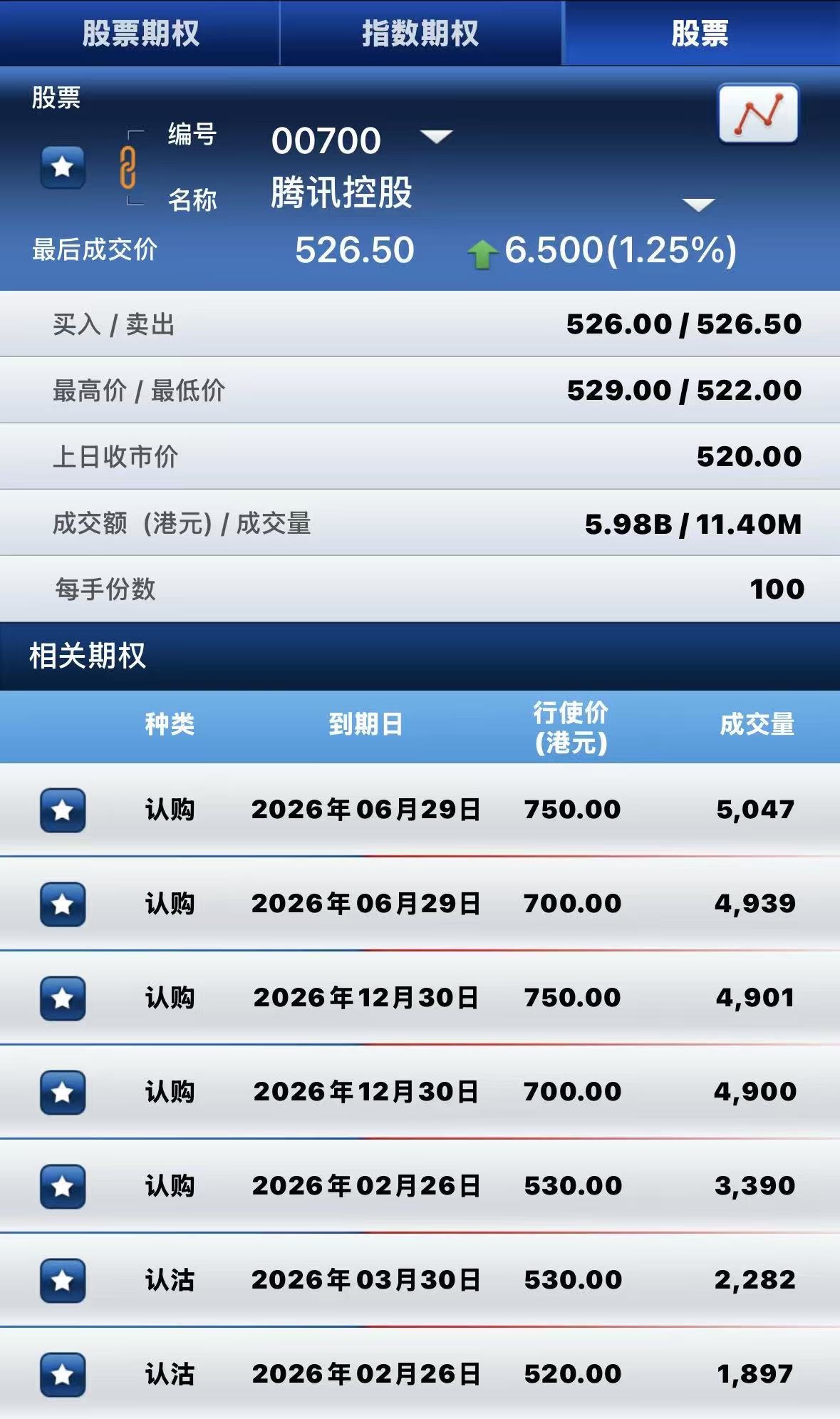腾讯控股涨超1%,半日成交超6万张合约,其中于6月29日到期行权价750港元的认购期权成交量居前,成交超5000张合约。 $TCH.HK 20260629 750.00 CALL$