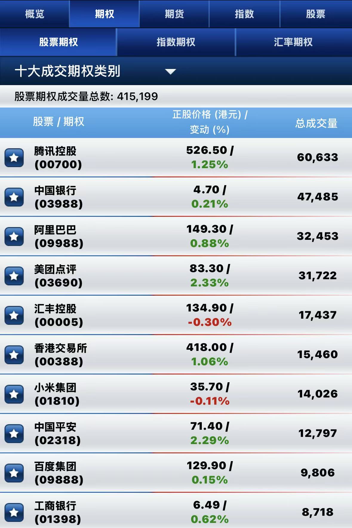 港股期权半日成交超41万张。其中,腾讯控股成交量居前,期权成交超6万张;中国银行名列次席,期权成交超4.7万张; 阿里巴巴-W位居第三,期权成交超3.2万张。