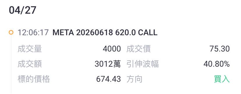 交易详情:买入 2026年6月18日到期、行权价620美元的看涨期权。