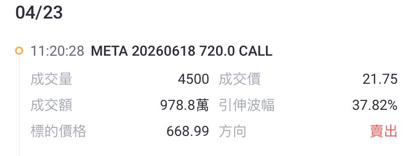 核心摘要: 财报前一周,META期权市场交易活跃,指标呈现显著分化。短期(5月1日到期)期权隐含波动率(IV)高达89.87%,定价财报后股价波动幅度达±9.41%,对应区间为$614.78 - $742.46。未平仓合约(OI)显示市场短期看涨倾向浓厚,700美元及710美元Call的OI均超万张。然而,远月(6月18日到期)大单交易揭示机构间巨大分歧:一方三千万美元买入620美元深度虚值Call,表达强烈长期看涨信念;另一方则通过卖出720美元Call及构建熊市看跌价差,为股价上行设置明确阻力,暗示市场对短期内突破720美元持谨慎态度。