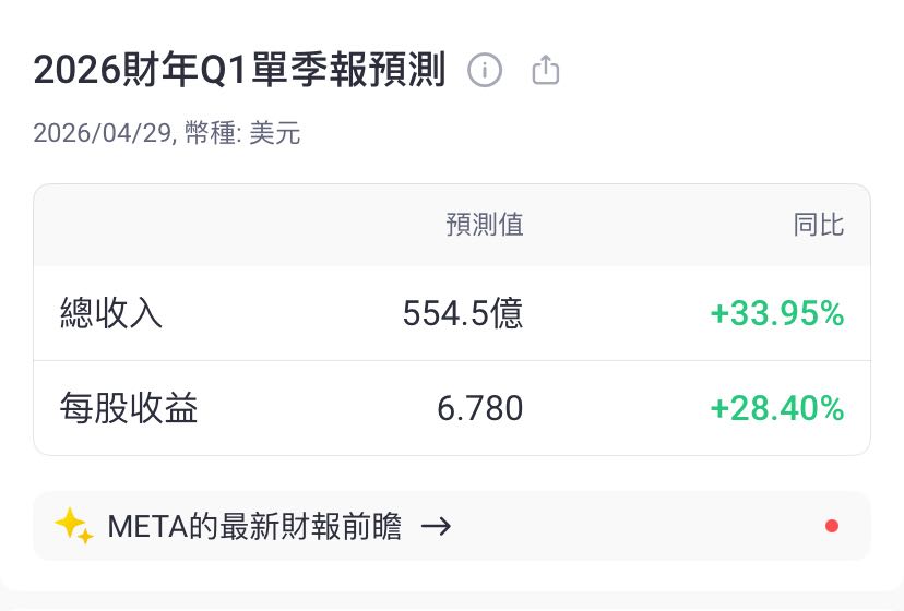 财报日期: Meta Platforms, Inc.(META)将于2026年04月29日(美股盘后) 发布最新季度财报。