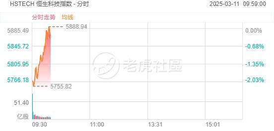 3月11日,恒生科技指数盘中转涨,此前跌超2%。