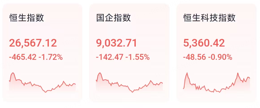 2月13日周五,受隔夜美股大跌影响,港股三大指数今日集体下跌,恒生科技指数午后跌幅明显缩窄,最终收跌0.9%,盘中曾大跌1.8%,恒生指数、国企指数跌势相对较大,分别下跌1.72%及1.55%,恒指再度失守27000点整数关,并且抹平此前反弹涨幅。南下资金大举净买入超200亿港元。
