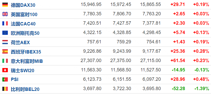 欧洲主要股指涨多跌少,截至发稿,德国DAX30指数涨0.19%,法国CAC40指数涨0.03%。