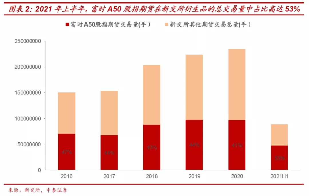 在本次港交所A50股指期货推出之前,新交所A50股指期货是目前境外唯一的A股指数标准化(富时中国A50)对冲产品,且与A股主要指数走势高度相关。目前新交所A50股指期货保持较高交易量和流动性,并对我国股票市场产生了一定影响。
