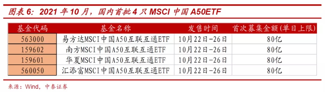 伴随港交所A50股指期货的推出,2021年10月国内首批4只MSCI中国A50ETF,预计未来上交所也或持续推出一系列ETF产品,丰富境内投资者的资产配置和交易工具。MSCI 中国A50 ETF跟踪中国行业优质龙头,覆盖范围广泛且成分结构更偏“新经济”;同时,基于国际指数包含大量的被动跟踪资金及风险对冲的机构投资资金,投资者结构或更为成熟,配合港交所MSCI A50股指期货的对冲工具,预期产品收益率或更加稳健。