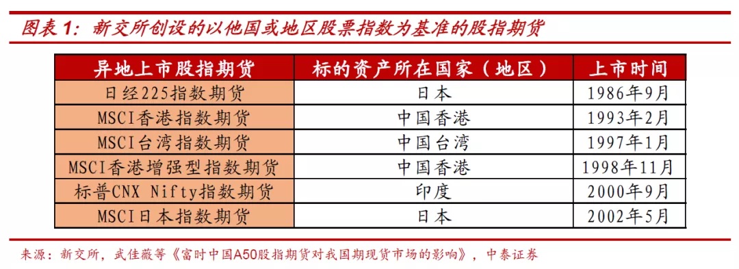 回顾全球金融衍生品市场的发展历史,在1980年代以来,全球金融加速发展、金融衍生品创新交易的浪潮背景下,一些发达国家或地区的交易所如洲际交易所、欧洲期货交易所、新交所等开始创设以他国或地区股票指数为基准的股指期货,以期增加自身市场的吸引力。例如,新交所一直致力于打造亚洲领先的离岸中心和衍生品交易中心,其40%的上市公司和超过80%的交易所债券来自新加坡境外。