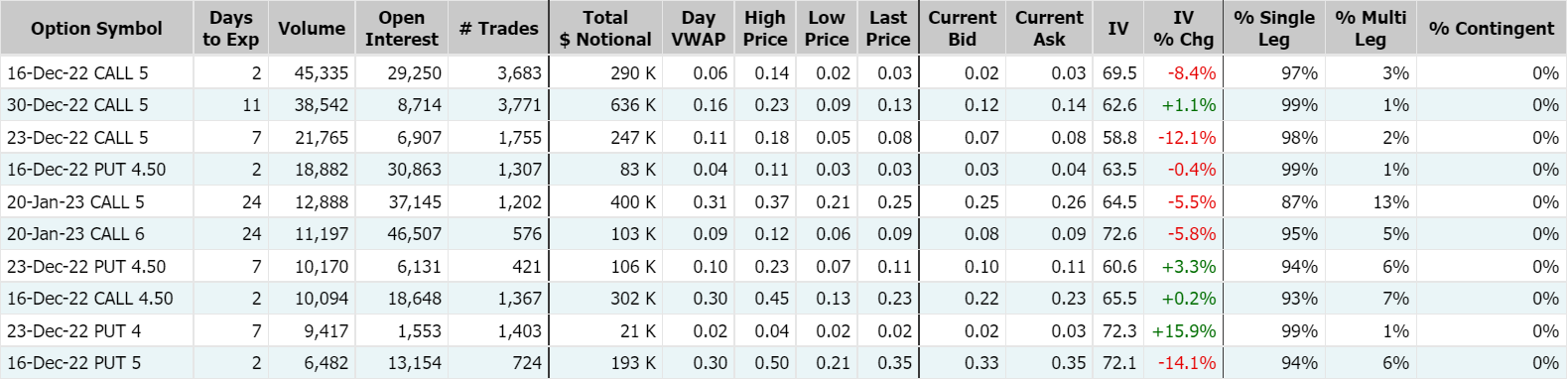 SoFi收涨逾6%,报4.7美元;消息面,首席执行官Anthony Noto在12月9日至13日期间,买入了该公司价值500万美元的普通股。周三期权成交296,433张合约,其中看涨期权占比76.3%;其中2022年12月16日到期的5美元行使价看涨期权的成交量特别高,成交量为45,335张。