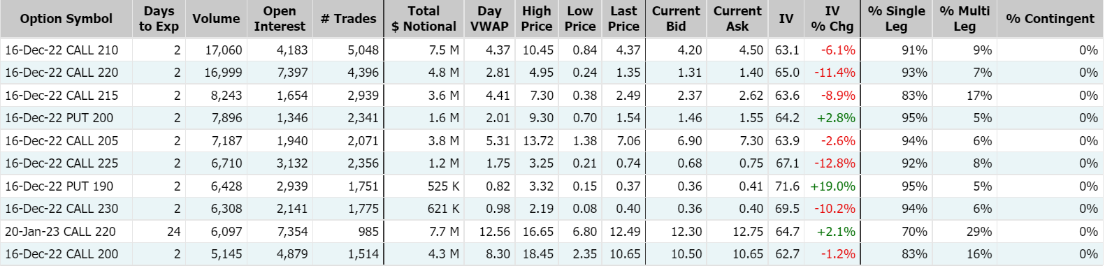 周三,期权市场总成交量达40,296,315张合约,高于90日平均成交量,其中看涨期权占比49%;特斯拉连跌三日,市值跌破5000亿美元,周三期权成交328.8万张合约,看跌期权占比57.6%;其中2022年12月16日到期的150美元行使价看跌期权的成交量特别高,成交量为147,754张。