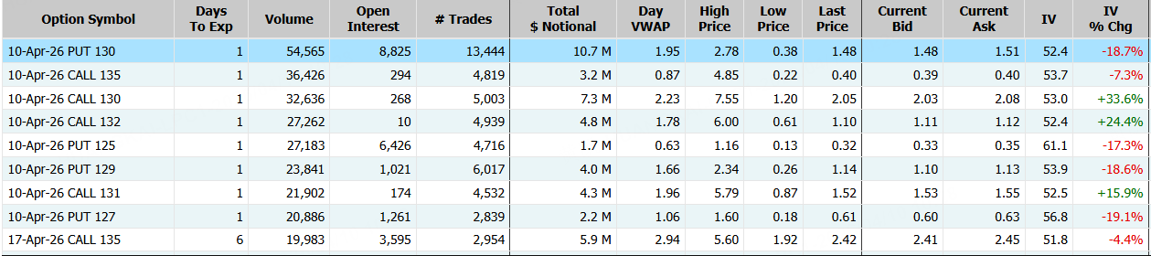 Palantir隔夜跌超7%,期权合约成交127.11万张,较90日均量放大2倍。4月10日到期的120美元的行权看跌期权交易量特别高,共有54,565份合约交易。