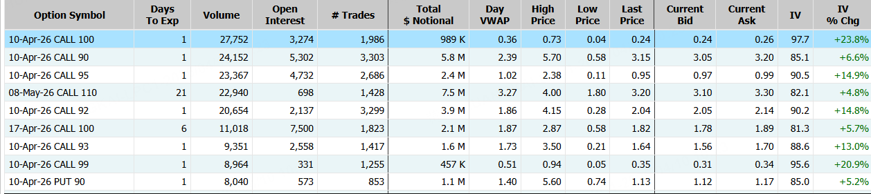 CoreWeave隔夜涨超11%,期权合约成交39.17万张,较90日均量放大1.9倍。4月10日到期的100美元的行权看涨期权交易量特别高,共有27,752份合约交易。