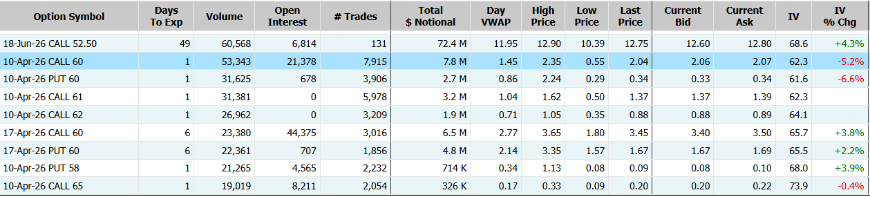 英特尔隔夜收高近5%,期权合约成交105.85万张,较90日均量放大2倍。4月10日到期的60美元的行权看涨期权交易量特别高,共有53,430份合约交易。