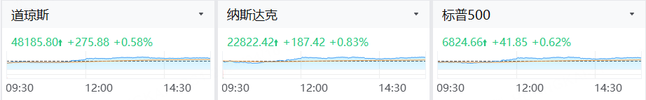 周四(4月9日),美股三大指数集体收升。截至收盘,标普500指数涨0.62%,报6824.66点;纳斯达克综合指数涨0.83%,报22822.42点;道琼斯指数涨0.58%,报48185.80点。