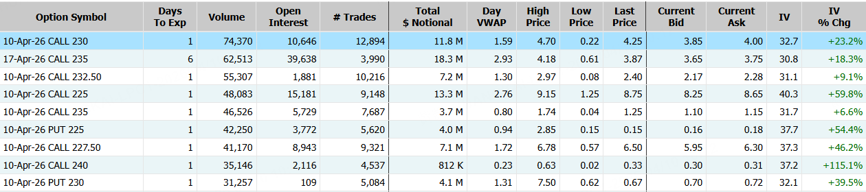 亚马逊隔夜收高5.60%,期权合约成交140.71万张,较90日均量放大2倍。4月10日到期的230美元的行权看涨期权交易量特别高,共有74,370份合约交易。