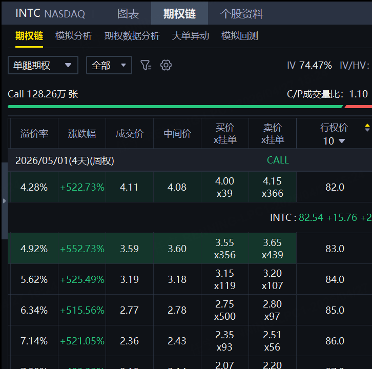 伴随股价暴涨,英特尔的认购合约集体飙升。5月1日到期的CALL,批量涨幅在500%以上。