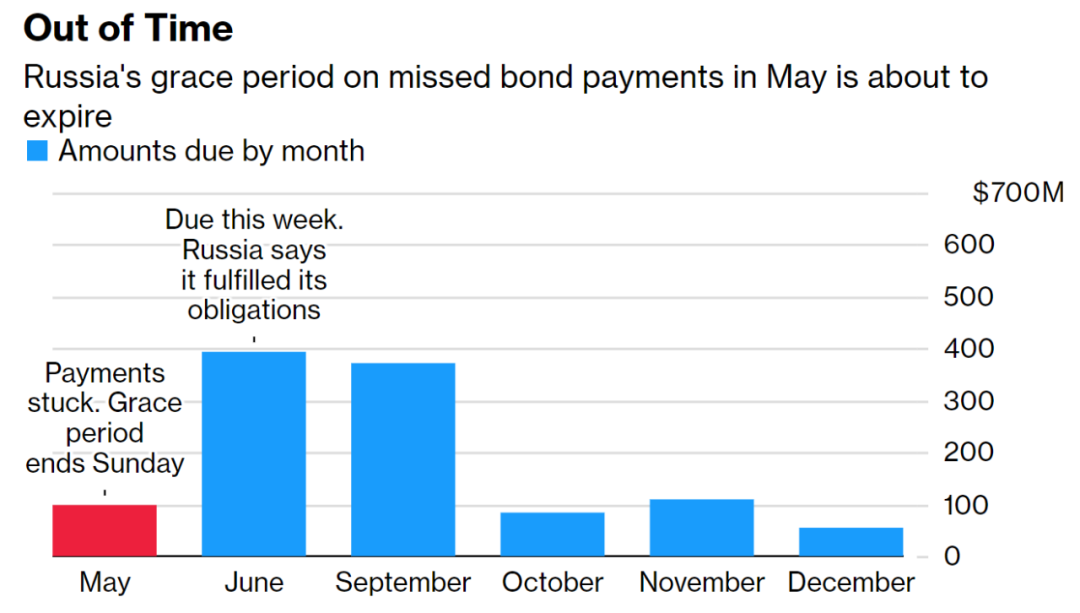 需要指出的是,一般正式宣告国家违约的声明,都是由国际评级机构发出,但制裁导致评级机构撤销了对俄罗斯实体的评级。根据周日宽限期结束的债券的相关文件,如果25%的债券持有人认同发生了“违约事件”,持有人也可自行做出宣告。