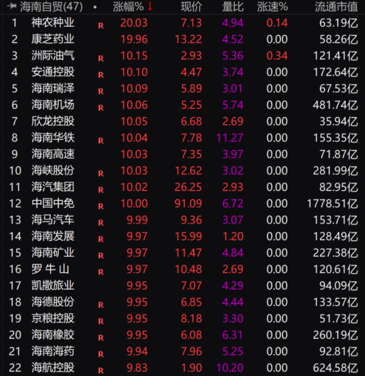 12月22日早盘,海南自贸板块全线爆发,一度22只股票封死涨停板。神农种业、康芝药业、洲际油气、安通控股、海南瑞泽、海南机场等率先涨停。