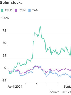 大约在同一时间,长期处于困境中的太阳能公司股价开始回升。道琼斯市场数据显示,这些公司周三收盘大幅上涨,创下自 5 月份以来的最大单日涨幅。