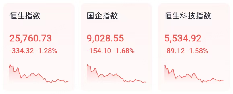 12月3日周三,港股三大指数低开低走呈现单边下跌行情。截至收盘,恒生指数跌1.28%再度失守26000点大关,国企指数、恒生科技指数分别下跌1.68%及1.58%。
