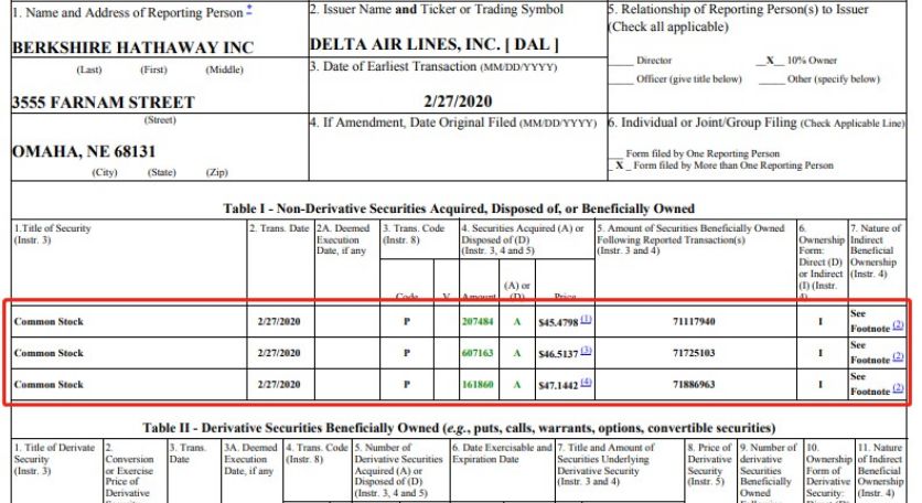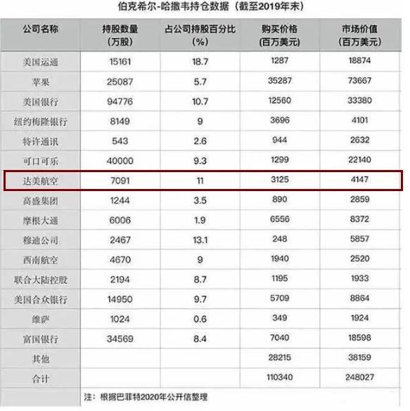 早在2月22日下午,伯克希尔公司发布了2019年的财报。财报显示,伯克希尔公司的十大重仓股中,达美航空排第九位。截至2019年末,伯克希尔持有7091万股达美航空股票,占公司持股百分比为11%。