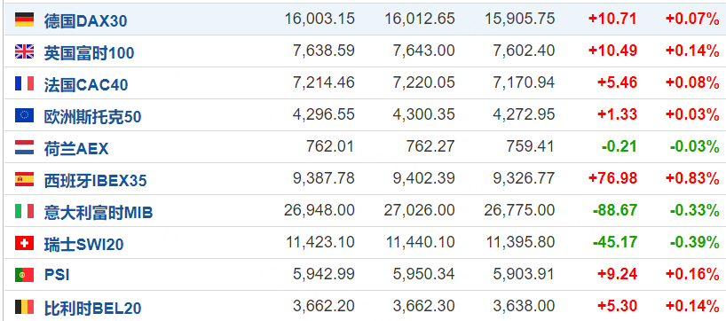 欧洲主要股指涨多跌少,截至发稿,德国DAX30指数涨0.07%,法国CAC40指数涨0.08%。