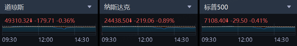 美东时间周四,美股三大指数在震荡交易中收低,市场对中东战争迅速结束的希望减弱,同时投资者还在消化一系列表现不一的企业财报,且围绕人工智能(AI)对软件行业冲击的担忧再度浮现。截至收盘,道指跌179.71点,跌幅为0.36%,报49310.32点;纳指跌219.06点,跌幅为0.89%,报24438.50点;标普500指数跌29.50点,跌幅为0.41%,报7108.40点。