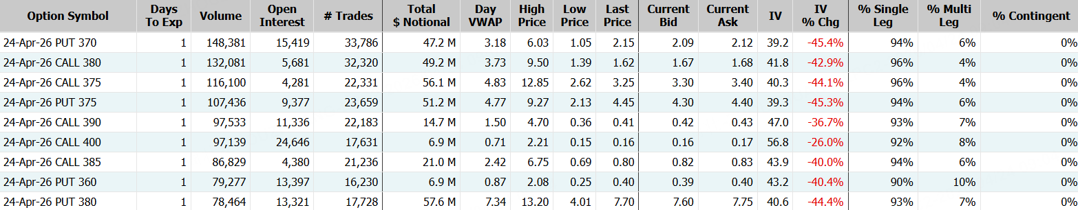 期权方面,特斯拉当日成交358.7万张,看涨期权占比59.4%,其中于4月24日到期的370美元行使价的看跌期权成交居前,成交近15万张。