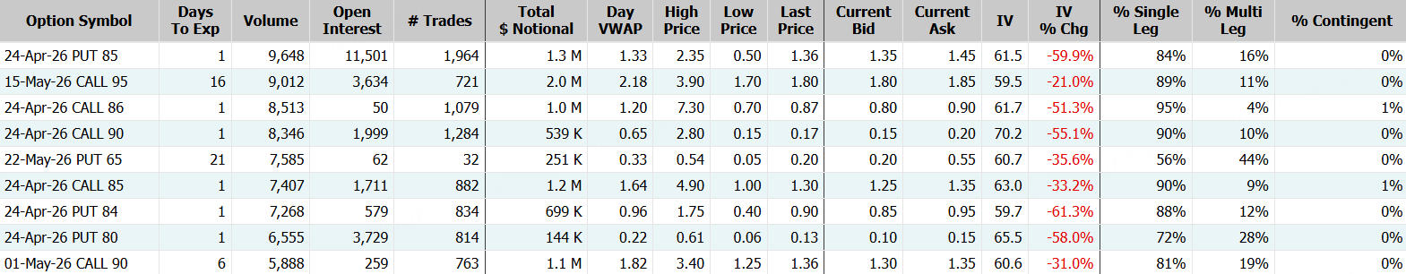 期权方面,ServiceNow当日成交39.75万张,较90日均量放大4倍,看涨期权占比57.9%,其中于4月22日到期的85美元行使价的看跌期权成交居前,成交9648张。