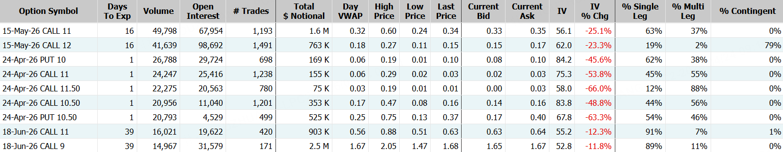 期权方面,诺基亚当日成交40.5万张,较90日均量放大近6倍,看涨期权占比84.1%,其中于5月15日到期的11美元行使价的看涨期权成交居前,成交近5万张。