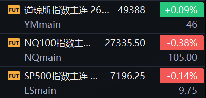 4月28日,美股三大股指期货涨跌不一,截止发稿,道指期货涨0.09%,纳指期货跌0.38%,标普500指数期货跌0.14%。
