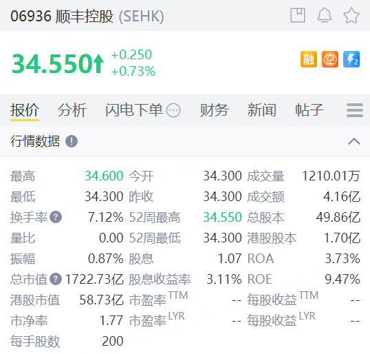 本周三 顺丰控股 正式登陆港股市场,首日平开,截至发稿报34.55港元,涨幅0.73%,开盘2分钟成交额破4亿港元。