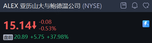 商业房地产公司 亚历山大与鲍德温公司 暴涨38%。消息上,亚历山大与鲍德温公司将被MW集团、黑石房地产和DivcoWest的合资企业以每股21.20美元的现金收购,公司估值(含债务)约为23亿美元。
