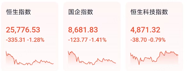 4月30日周四,港股三大指数集体下跌。截至收盘,恒生科技指数跌0.79%,恒生指数跌1.28%,国企指数跌1.41%。