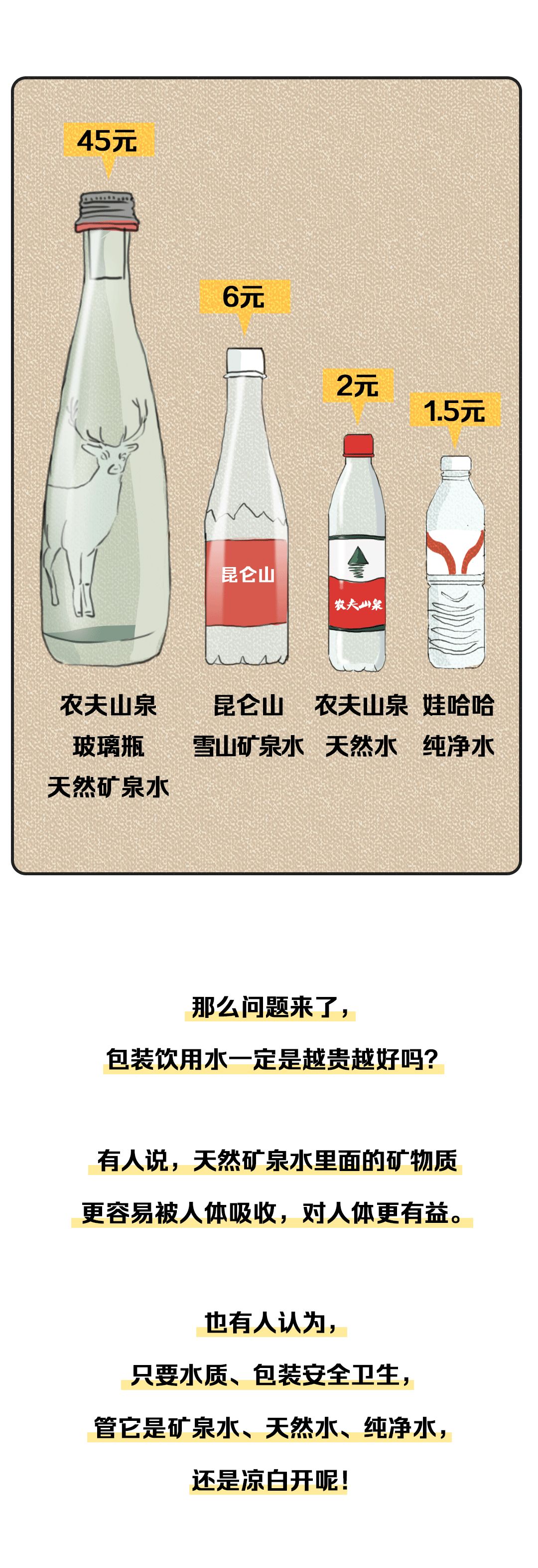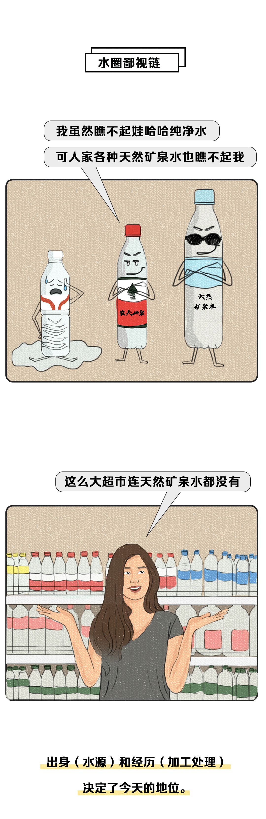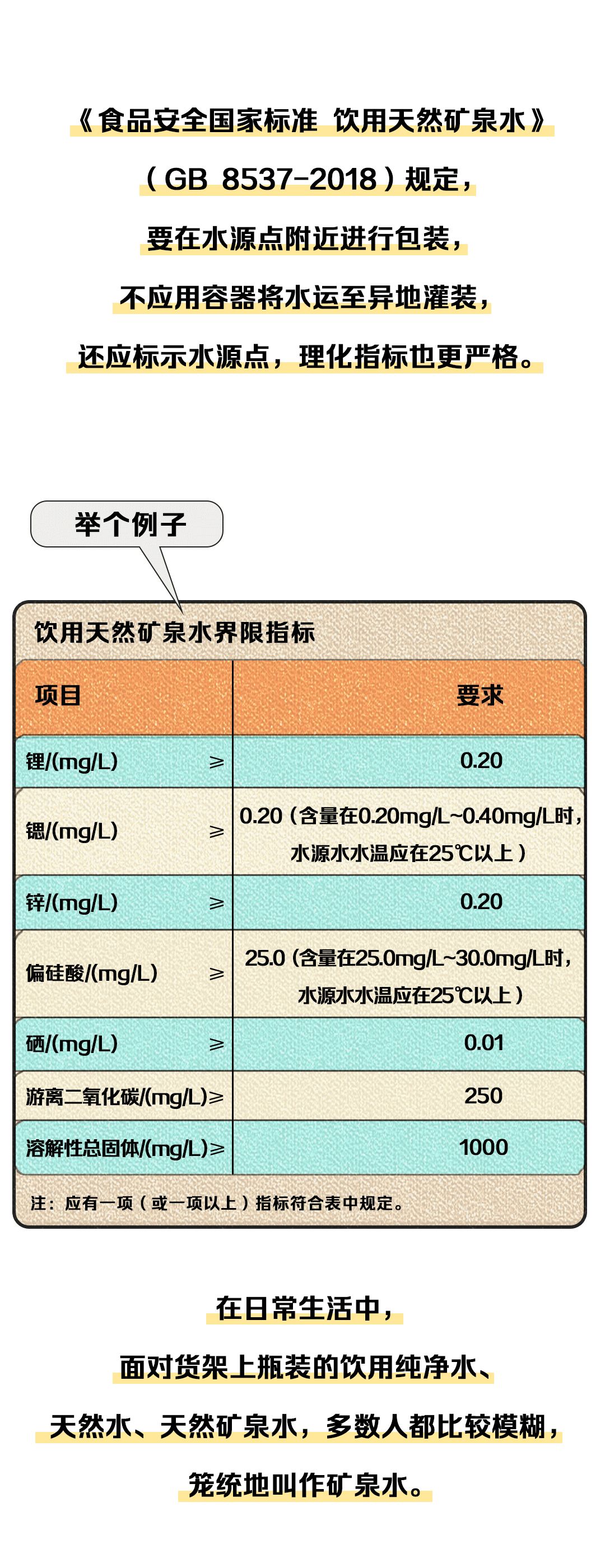 2. 饮用天然矿泉水:对水源要求最高,标准也最严格。从地下深处自然涌出或经钻井采集的水,含有一定量的矿物质、微量元素或其他成分,在一定区域未受污染并采取预防措施避免污染的水;在通常情况下,其化学成分、流量、水温等动态指标在天然周期波动范围内相对稳定。如恒大冰泉、百岁山饮用天然矿泉水。