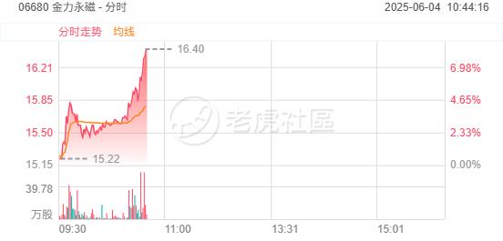 本周三(6月4日)港股早盘, 金力永磁 续涨超7%,截至发稿报16.4港元,本周已累涨超15%: