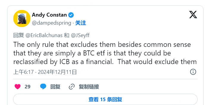 MicroStrategy 的软件业务在纳入纳斯达克基准指数时具有一定优势,因为金融公司不符合纳斯达克100指数的纳入标准。尽管 MicroStrategy 称自己为“比特币财务公司”,但由于其收入来源于软件业务,根据行业分类基准 (ICB),它被归类为科技公司,因此可以被纳入指数。然而,据彭博智能分析师 James Seyffart 称,ICB 可能会在明年3月的分类调整中将其重新归类为金融股。