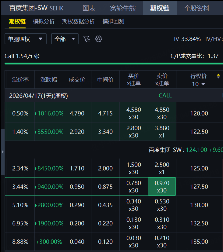 期权方面,百度的认购合约全线飙升。其中,一张周五到期的CALL,行权价127.5港元,价格狂涨9400%!