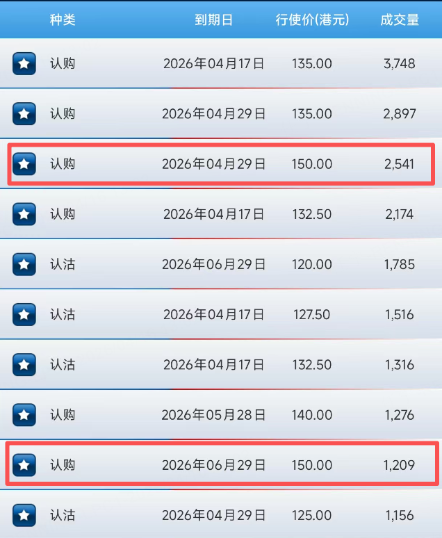 期权方面,阿里上午成交前十的合约中,认购单占比较多。其中两张认购合约布局150港元,行权日分别为4月29日及6月29日。