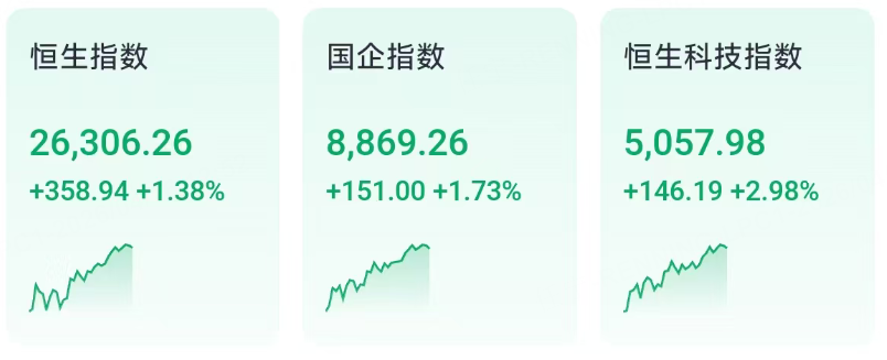 周四,港股早盘高开高走,恒生科技指数收复5000点关口,成分股全线上涨。恒指午间收涨1.38%,报26306.26点;科指收涨2.98%,报5057.98点。