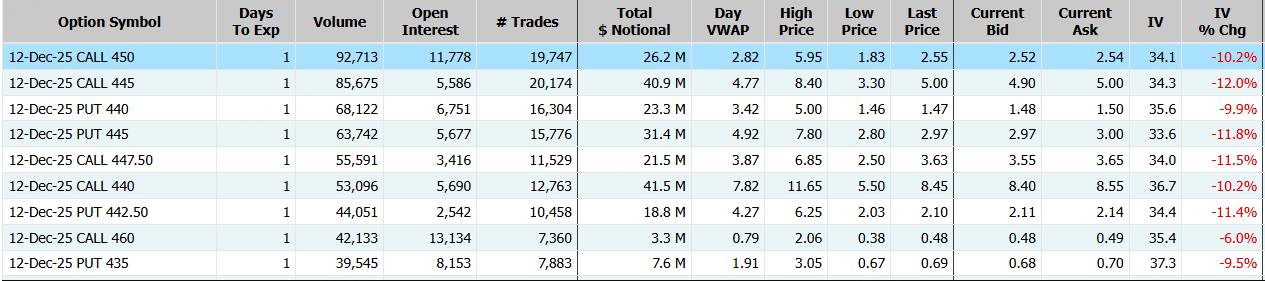 特斯拉隔夜跌超1%,期权合约成交184.72万张,12月12日到期的450美元的行权看涨期权交易量特别高,共有92,713份合约交易。 $TSLA 20251212 450.0 CALL$
