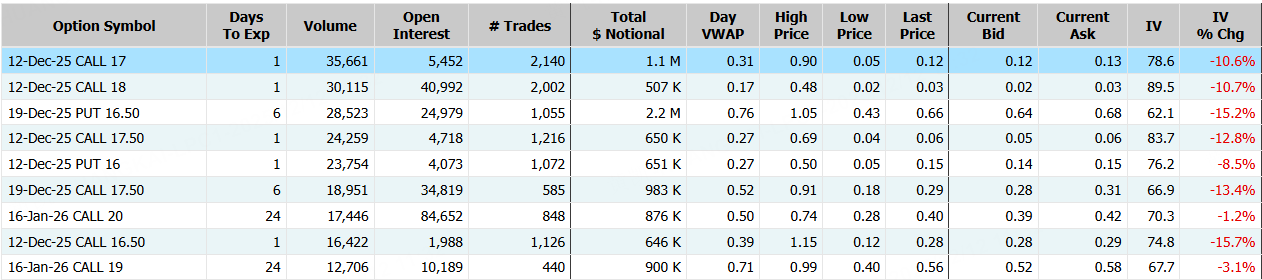 美国电动汽车公司Rivian Automotive隔夜跌超6%,期权合约成交49.9万张,较90日均量放大3.1倍。12月12日到期的17美元的行权看涨期权交易量特别高,共有35,661份合约交易。 $RIVN 20251212 17.0 CALL$