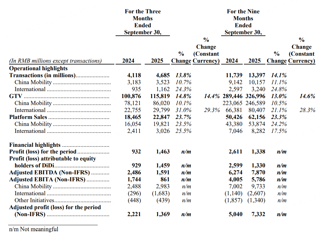 11月26日,滴滴在其官网发布2025年第三季度业绩报告。延续了此前增长态势,三季度滴滴订单量和GTV仍保持双位数的稳定增长。三季度,滴滴核心平台(中国出行和国际业务)订单量达46.85亿单,同比增长13.8%,季度日均订单量首次突破5000万单。其中,中国出行同比增长10.7%至35.23亿单,日均3830万单;国际业务同比增长24.3%至11.62亿单,日均1263万单。随着订单量的不断增长,滴滴三季度GTV规模达到1158亿元,实现净利润15亿元。
