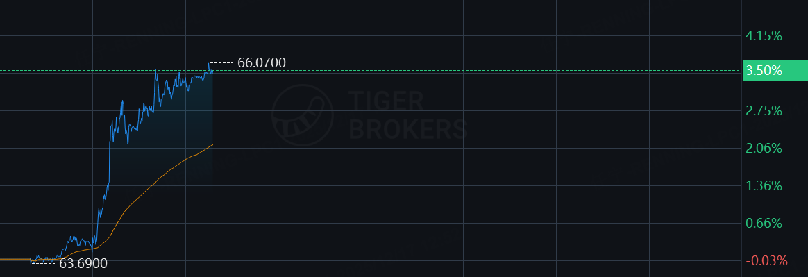 周三,现货白银强劲拉升大涨3.5%,史上首次站上66美元/盎司,日内连破两关。