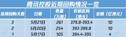 连续第三日回购!腾讯控股公告:公司于2024年5月21日斥资10.03亿港元回购261万股股份,每股回购价格为379.8-393.4港元。