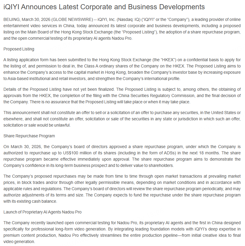 3月30日,爱奇艺盘前飙升10%!该公司称已以保密方式向香港联合交易所提交上市申请表。同日,公司董事会批准了一项股份回购计划,授权公司在未来18个月内回购至多价值1亿美元的股份(包括美国存托股份形式)。该股份回购计划自批准之日起立即生效。