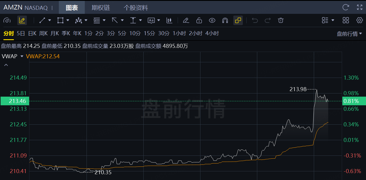 亚马逊盘前拉升,一度涨超1%。