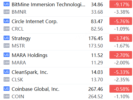 加密货币概念股下跌,BitMine跌超3%,MARA Holdings、CleanSpark跌超2%,Strategy、Circle、Coinbase跌超1%。