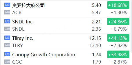 大麻概念股上涨,Tilray涨近8%,SNDL涨近7%,Canopy Growth涨近3%,奥罗拉大麻公司涨超1%。