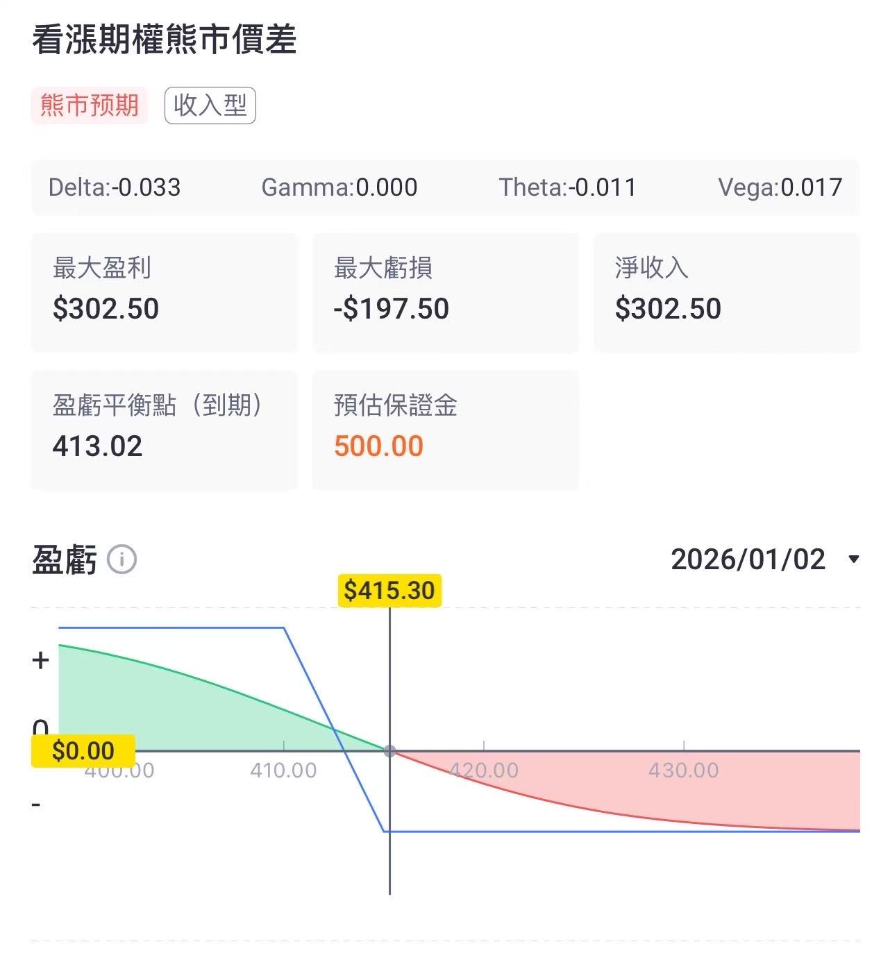 卖出一张2026年1月2日到期、行权价为410的CALL